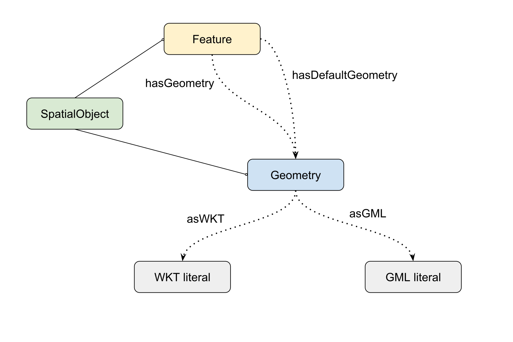 The following picture is a simplified diagram of the GeoSPARQL classes Feature and Geometry, as well as some of their properties :